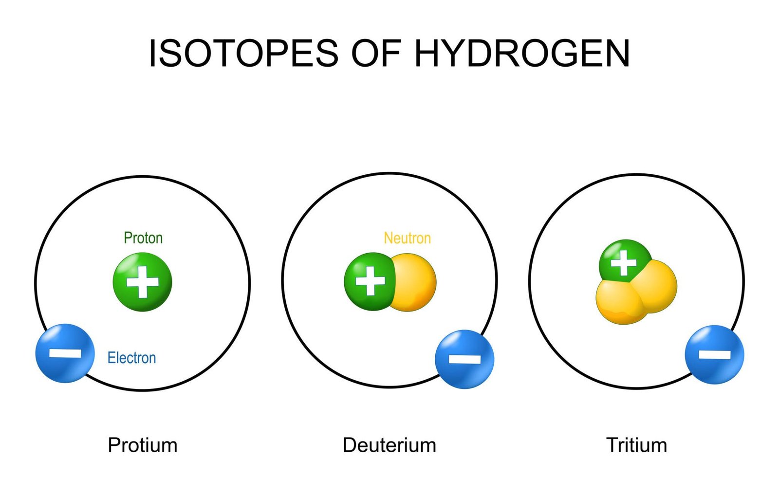 Deuterium is one of the three forms (called isotopes) of the first element, hydrogen. The first hydrogen isotope is named ‘protium’ (the most abundant by far and the lightest), consisting of a proton and an electron. Protium is commonly expressed by the symbol ‘1H’. The second isotope is named ‘deuterium’ (much less abundant than protium but twice as heavy due to the addition of a neutron). Deuterium is commonly expressed by the symbol ‘D’ or ‘ 2H’.